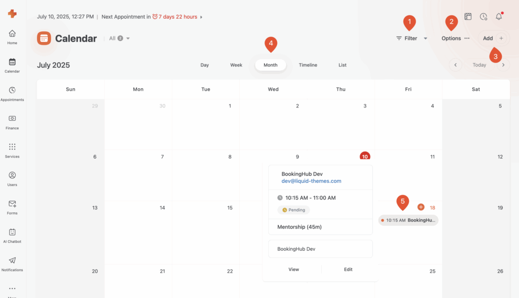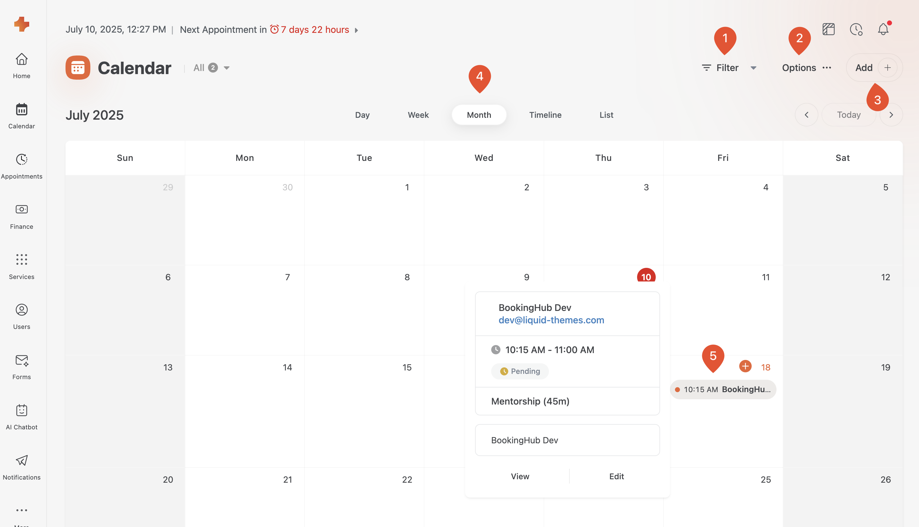 BookingHub’s calendar offers a clear overview for managing your appointments. Access it via BookingHub -> Calendar.