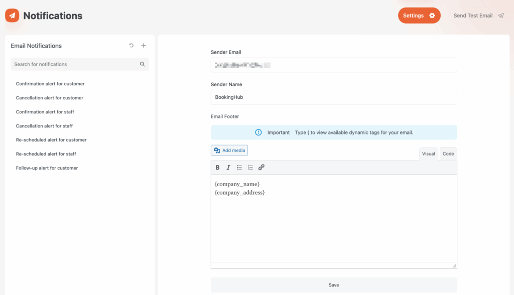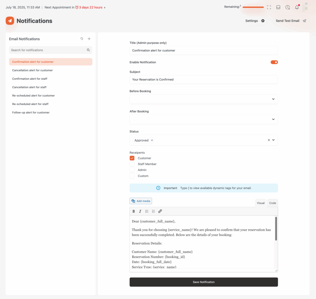 BookingHub allows you to send automated email notifications to customers, staff, and admins based on booking events like confirmations, cancellations, reschedules, and more. Follow this guide to create and customize these notifications easily.