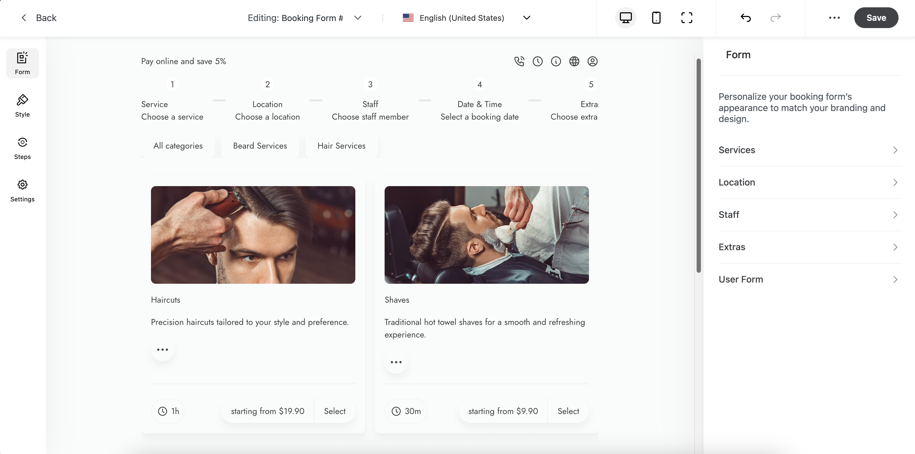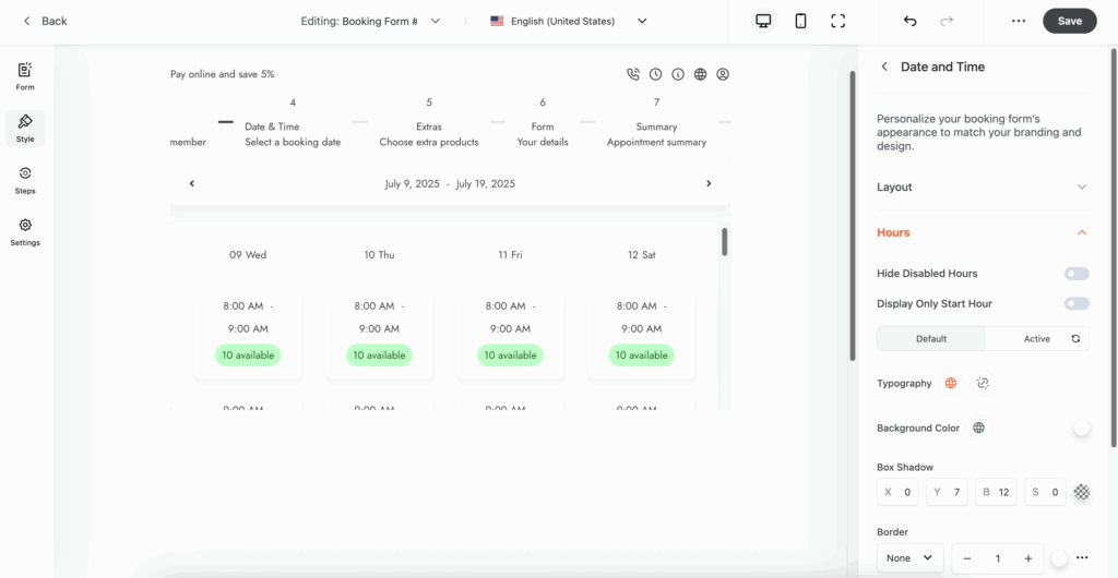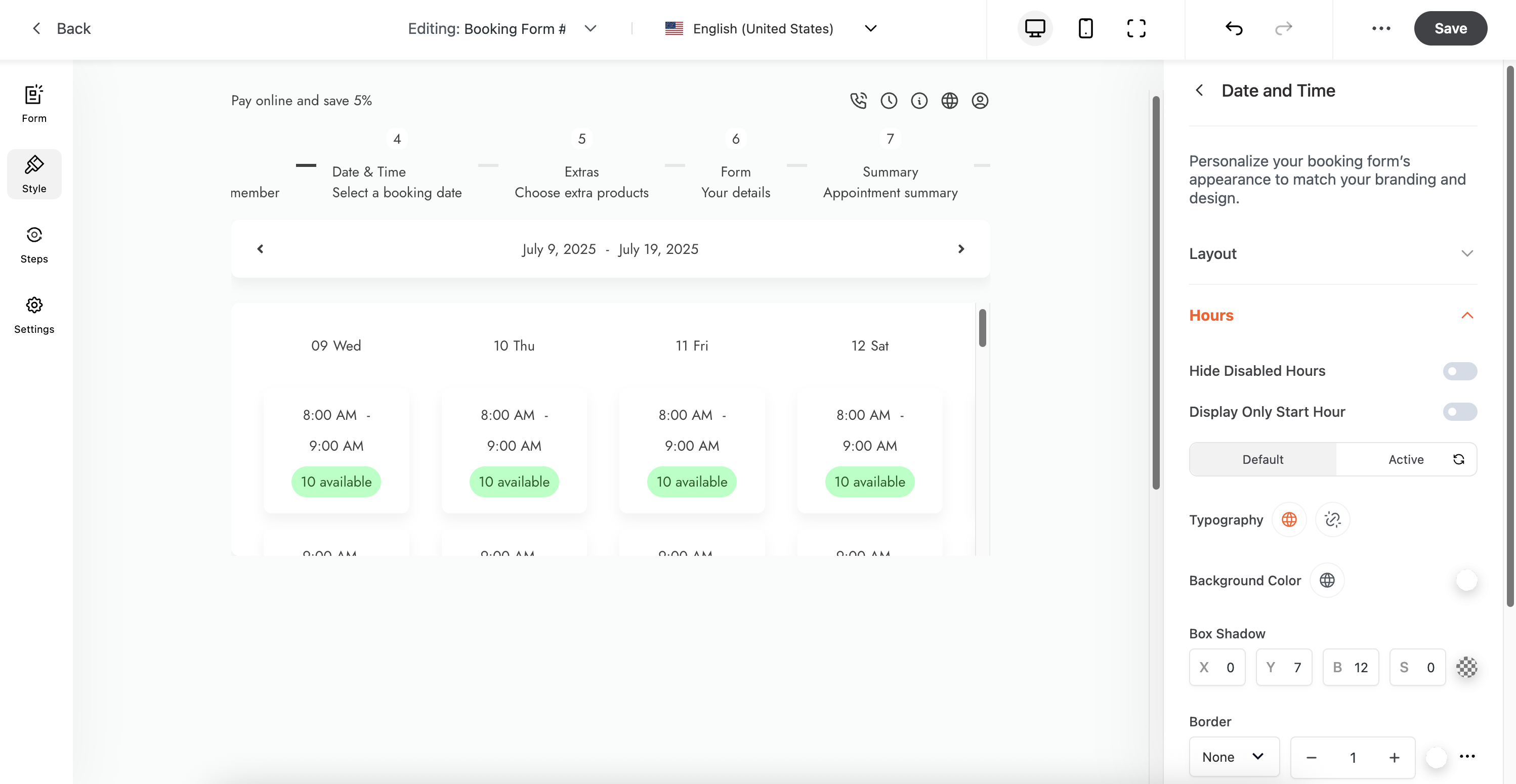 Left Sidebar: Tabs for Form, Style, Steps, Settings