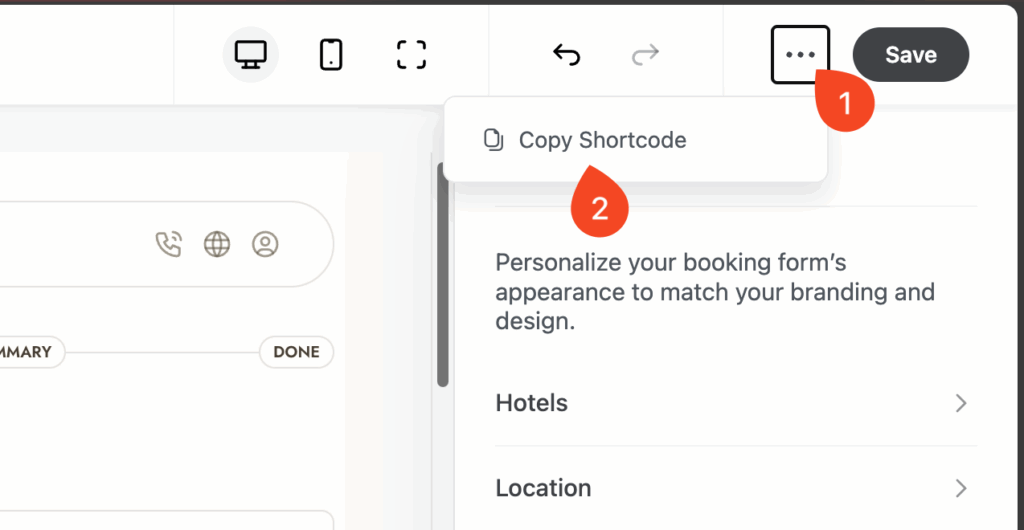 To embed: click the three‑dots icon next to Save → copy the shortcode